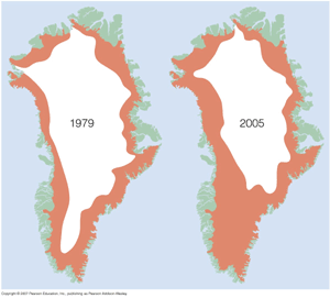 Answer: The uncertainty concerns the timing and the precise nature of the consequences of global warming. Earth's climate has numerous complexities and feedbacks that could alleviate, moderate, or exacerbate the consequences of global warming over the next few decades to centuries. It is this uncertainty that has provided room for a small number of scientists (and a larger number of non-scientists) to question the general consensus that we should be taking immediate steps to reduce global warming. Remember, however, that even among the very few scientists who count themselves as "global warming skeptics," there is no dispute that significant warming would eventually occur. It's just that they think we can safely wait for new technologies rather than taking expensive action now. From my perspective, this is rather like having a doctor tell you not to worry about quitting smoking, since we may find a cure for lung cancer before you die from it. With that, you can now understand the nature of the IPCC report. It is not a report about whether the basic science of global warming is real - there's no doubt about that. Rather, it is a report about attempts to predict the short-term (decades to centuries) consequences of global warming. In essence, hundreds of the world's leading climate scientists got together to sift through research conducted by thousands of their colleagues, in an attempt to consolidate all this research into one "best estimate" of the problem we face. This best estimate could certainly be overstating the short-term problem (as the "global warming skeptics" argue), but it could also be understating it. Personally, I suspect that it is understating the consequences in at least one critical area: sea level rise. The report predicts only a modest rise in sea level (though still bad news for the vast numbers of people living in low-lying coastal areas), but in making this prediction the IPCC scientists decided not to take into account recent data showing an unexpectedly rapid melting of polar glaciers (especially in Greenland; see figure below). If these new data hold up to further scrutiny (and I think they will), the expected sea level rise will be much more significant. And while even at this accelerated rate it would probably take many centuries to melt all polar ice, remember this fact: Melting of the Greenland ice sheet would raise sea level about 20 feet, and melting of the Antarctic ice sheet would raise sea level more than 200 feet. Are you willing to risk setting our planet on a course where future generations will need deep-sea diving gear to visit places like New York City and San Diego?